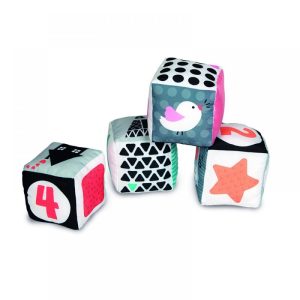 Τέσσερις μαλακοί κύβοι, ειδικά σχεδιασμένοι για τα μωρά. Τα διαφορετικά υλικά, οι διάφορες υφές, ο καθρέφτης, οι επιφάνειες που κάνουν θόρυβο και η κουδουνίστρα διεγείρουν την όραση, την ακοή, τις χειρωνακτικές και αισθητηριακές δεξιότητες. Τα ασπρόμαυρα και τα χρώματα με αντιθέσεις ενθαρρύνουν την οπτική ανάπτυξη από τους πρώτους μήνες του μωρού. Με πρακτικά κορδονάκια για να δένετε τους κύβους μαζί.
