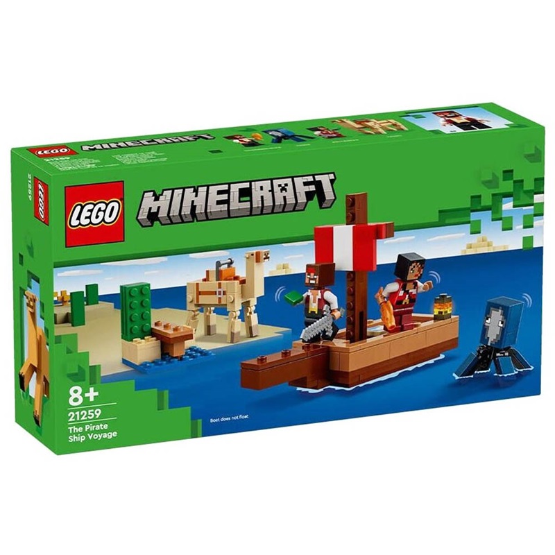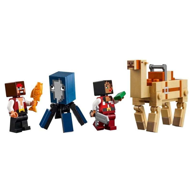 Επάνδρωσε το πλοίο με 2 LEGO® Minecraft® πειρατές και άνοιξε πανιά για περιπέτειες στη διάπλαση της Ερήμου. Τι παραμονεύει μέσα στον νερό; Ένα καλαμάρι! Κατευθύνσου προς την ξηρά, όπου μπορείς να συμβουλευτείς τον χάρτη, σέλωσε την καμήλα και πήγαινε μια βόλτα προς την επόμενη, επική σου περιπέτεια Minecraft. Η συσκευασία περιέχει 166 κομμάτια.