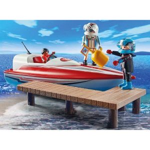 Playmobil Αγωνιστικό ταχύπλοο σκάφος με μοτέρ. Η συσκευασία περιλαμβάνει: φιγούρες: 2 άνδρες, 1 αγόρι, αξεσουάρ: 1 ταχύπλοο, 1 προβλήτα, 1 υποβρύχιος κινητήρας, 2 κράνη, 1 σημαδούρα, 1 γιακάς, 1 σωσίβιο.
