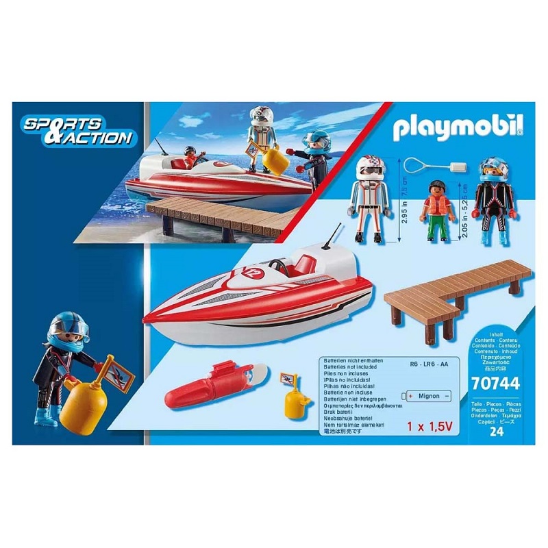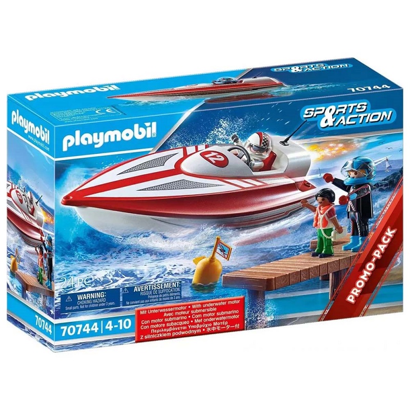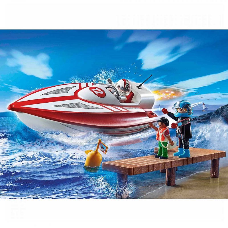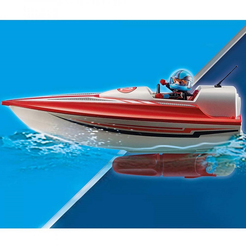 Playmobil Αγωνιστικό ταχύπλοο σκάφος με μοτέρ. Η συσκευασία περιλαμβάνει: φιγούρες: 2 άνδρες, 1 αγόρι, αξεσουάρ: 1 ταχύπλοο, 1 προβλήτα, 1 υποβρύχιος κινητήρας, 2 κράνη, 1 σημαδούρα, 1 γιακάς, 1 σωσίβιο.