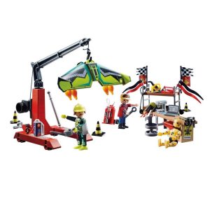 Στο Air Stunt Show Συνεργείο, συντηρούνται και επισκευάζονται όλα τα αεροσκάφη. Μόλις έφτασε ένας πιλότος με το wingsuit που παρουσίασε βλάβη κατά την απογείωση. Ο μηχανικός σηκώνει πολύ προσεκτικά το wingsuit με τον γερανό για να το ελέγξει από όλες τις πλευρές. Υπάρχει βλάβη στο δεξί φτερό, χρειαζόμαστε άμεσα ένα εξειδικευμένο ανταλλακτικό. Ευτυχώς, το συνεργείο διαθέτει όλα τα απαραίτητα εξαρτήματα για την επισκευή του. Το σετ παιχνιδιού περιλαμβάνει δύο φιγούρες PLAYMOBIL, ένα wingsuit, έναν γερανό με βαρούλκο, μία εργαλειοθήκη και πολλά άλλα εργαλεία.