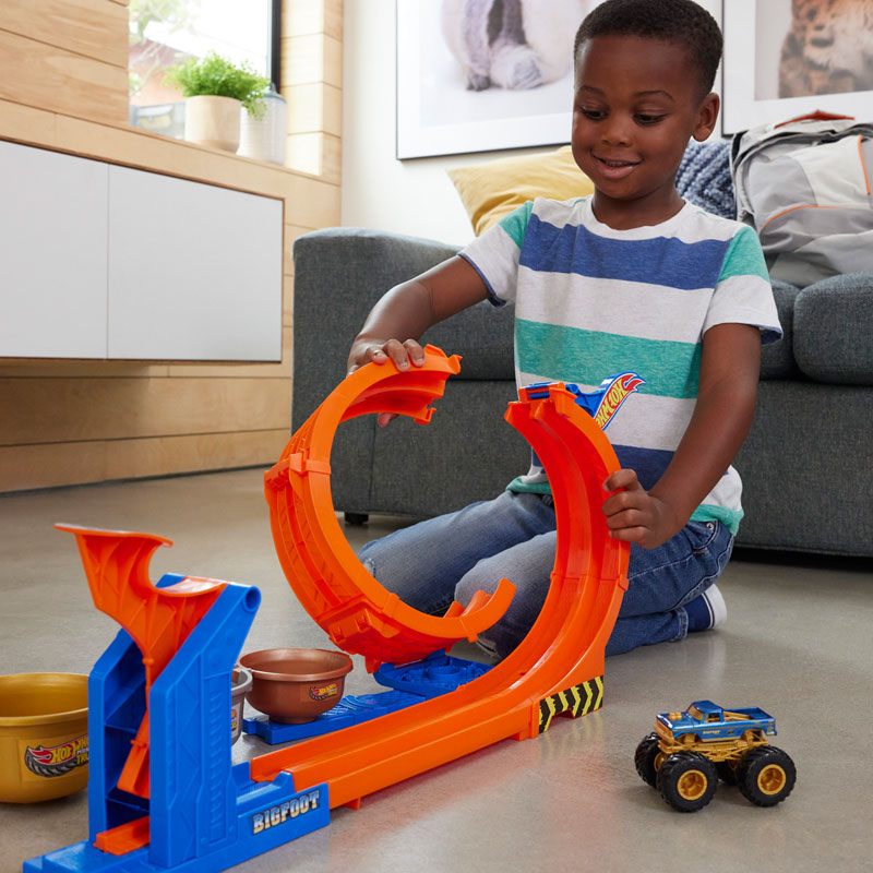 Γιορτάστε την 50ή επέτειο του Bigfoot με το σετ παιχνιδιού Hot Wheels Monster Trucks Loop-And-Flip Trophy Challenge! Έχει δύο πιθανές ρυθμίσεις: Εκκινήστε το συμπεριλαμβανόμενο Bigfoot σε κλίμακα 1:64 σε μία πλήρη λούπα σε ένα κύπελλο τρόπαιο ή αντιστρέψτε την λούπα έτσι ώστε ο Bigfoot να κάνει ένα backflip σε ένα από τα κύπελλα. Τα τρόπαια ποικίλλουν ως προς το μέγεθος και την αξία των πόντων για να αυξήσετε την πρόκληση και να παρέχουν διαφορετικούς τρόπους για να παίξετε ο πρώτος που θα προσγειωθεί σε κάθε κύπελλο ή θα κερδίσει τους περισσότερους πόντους. Το Die-cast Bigfoot έχει μια αποκλειστική διακόσμηση για να τιμήσει την 50η επέτειό του! Τα χρώματα και τα διακοσμητικά μπορεί να διαφέρουν. Αγώνες και κόλπο με ένα φορτηγό παιχνίδι Bigfoot για 50 χρόνια επετείου στο σετ παιχνιδιού Hot Wheels Monster Trucks Loop-And-Flip Trophy Challenge! Υπάρχουν δύο τρόποι για να παίξετε με δύο εύκολες ρυθμίσεις που προκαλούν τις δεξιότητες εκτόξευσης. Εκτοξεύστε το Bigfoot μέσω της λούπας με τη σωστή ποσότητα δύναμης για να κερδίσετε τους μεγάλους πόντους! Αφαιρέστε το μισό βρόχο για να ρίξετε το Bigfoot σε ένα backflip και προσγειωθείτε στα κύπελλα τροπαίων. Το σετ περιλαμβάνει ένα 1:64 Hot Wheels Monster Trucks Bigfoot με αποκλειστική διακόσμηση για την 50η επέτειο. Δοκιμάστε το Trophy Challenge με οποιοδήποτε φορτηγό κλίμακας 1:64. (Επιπλέον φορτηγά πωλούνται χωριστά.) Περιλαμβάνει: 1 Hot Wheels Monster Trucks Loop-and-Flip Challenge και 1 Die-cast Hot Wheels Monster Trucks 50ης επετείου Bigfoot.