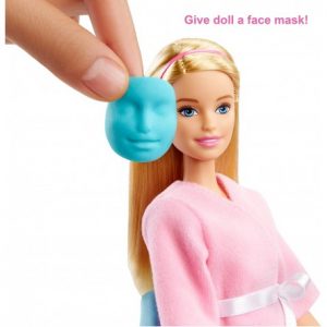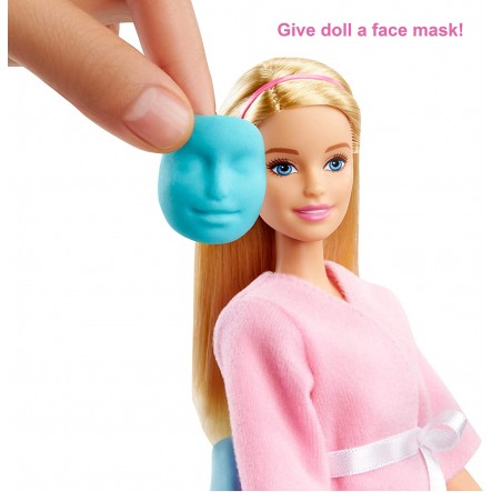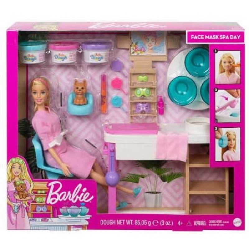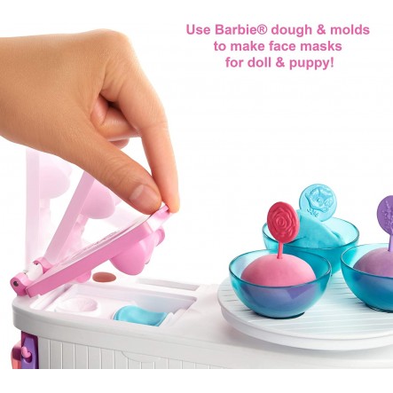 Το σετ προσώπου spa περιλαμβάνει κούκλα Barbie που φοράει ρόμπα και παπούτσια, κουτάβι, σταθμό σπα με χώρο αποθήκευσης και καλούπια, τρεις μπανιέρες ζύμης Barbie, κηλίδα, μια καρέκλα, ένα κρεβάτι για κατοικίδια και αξεσουάρ . Η κούκλα δεν μπορεί να μείνει μόνη της. Τα χρώματα και οι διακοσμήσεις μπορεί να διαφέρουν.