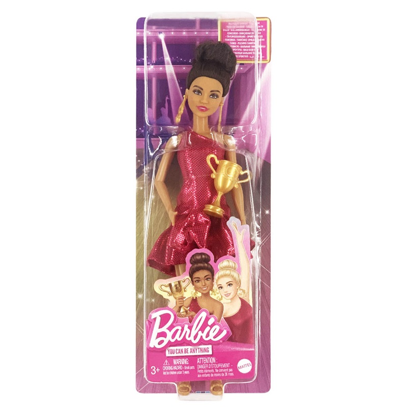 Με χρυσά τακούνια χορού, η κούκλα είναι έτοιμη να εμφανιστεί με το λαμπερό κόκκινο φόρεμα με το βολάν στο στρίφωμα και τα χρυσά σκουλαρίκια. Τα μαλλιά της με κότσο στην κορυφή ολοκληρώνουν την πρωταθλητική της εμφάνιση. Μαζί με το αξεσουάρ της, το τρόπαιο, αφήστε τη φαντασία σας να πρωταγωνιστήσει!